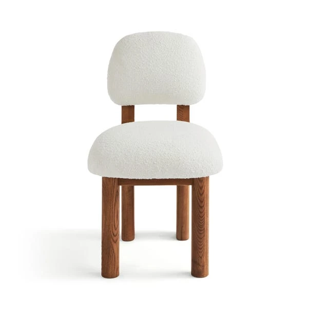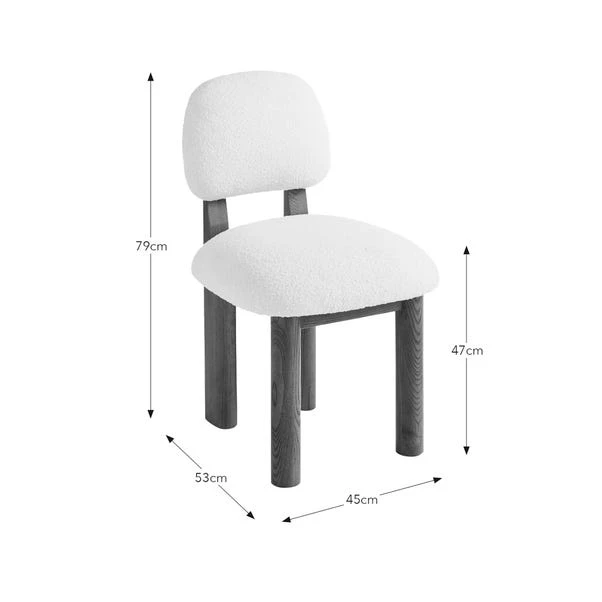 This chair features a plush boucle fabric that adds texture and sophistication to any dining space. The curved backrest and padded seat ensure exceptional comfort, making every meal a delightful experience. The dark stained ash frame enhances the chair’s modern elegance, providing both durability and style.