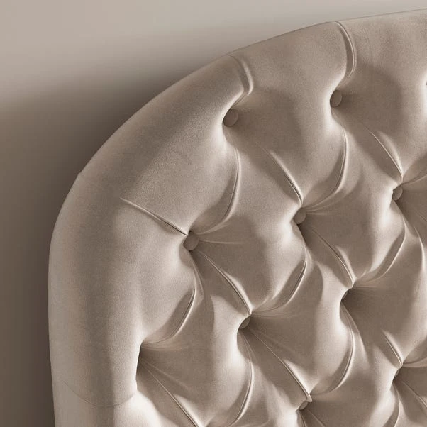This bed frame brings a touch of opulence and glamour to your bedroom with its luxurious hand-sewn fabric finish and elegant wooden legs. The bed features a stunning curved Chesterfield-style headboard, adding timeless sophistication to any décor. Equipped with a spring slatted base, it offers enhanced support and comfort for a restful night’s sleep.