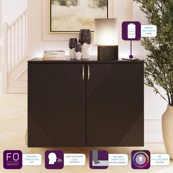 This sideboard is a glamorous and contemporary addition to your living space with smart features that redefine functionality. Its refined painted finish, paired with muted gold brushed shard handles and feet, exudes boutique sophistication. Inside, discover versatile storage for tableware, linens, or a chic drinks cabinet, with ample space for wine, spirits, and glassware. Frank Olsen’s signature scratch-resistant midnight purple interior embodies enduring style. Seamlessly integrating smart technology, control the LED lights through an app or voice commands via your smart speaker, setting the perfect ambience effortlessly. Enjoy added convenience with the discreet wireless charging point, effortlessly powering up your phone while seamlessly blending technology and functionality.