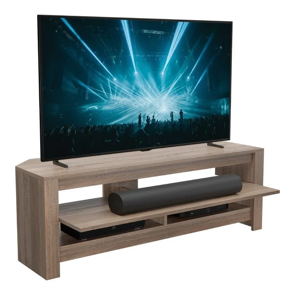 Add both character and convenience to your living room with this rustic-look TV stand. Finished in a warm rustic effect, it supports TVs up to 65″ and 40kg. Designed to tuck into corners or sit along a flat wall, it features a clever pull-out shelf for your soundbar—giving you the choice between a neat, tucked-away look or improved acoustics during movie night.