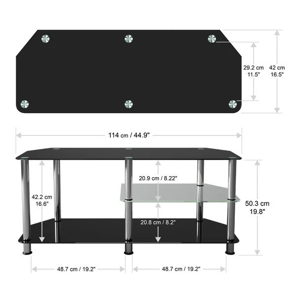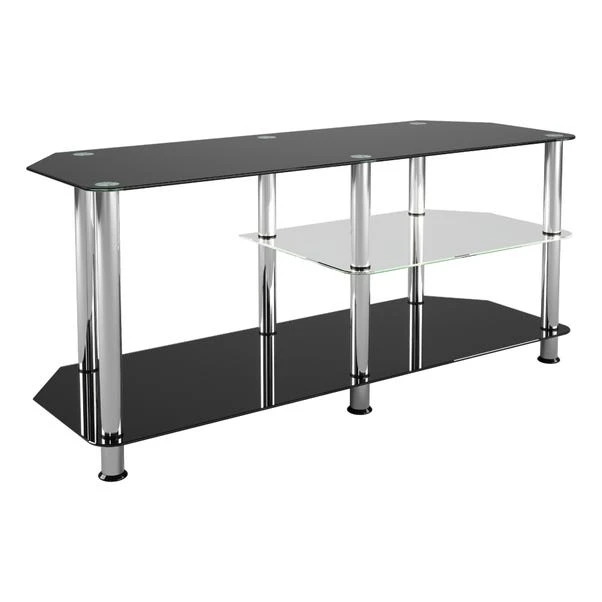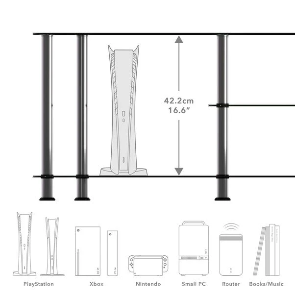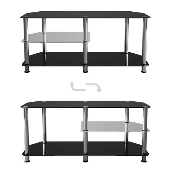 A stylish and practical choice for contemporary homes, this sleek glass TV stand supports screens up to 55″ and 45kg. Designed to fit perfectly into a corner or sit flush along a flat wall, it features a tall central storage space—ideal for games consoles or larger media devices. The reversible clear glass shelf can be fitted to the left or right, offering flexible storage options.