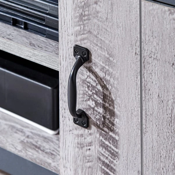 Boasting a bold industrial-chic design, the Boston TV Stand is perfect for brining a contemporary design statement to your living space. This modern unit boasts a chunky construction and features two open shelves for media devices with wide cable apertures as well as two spacious cupboards with magnetic catches. The industrial look is accentuated by the distressed grey finish with contrasting black metal handles and dark grey wooden frame.