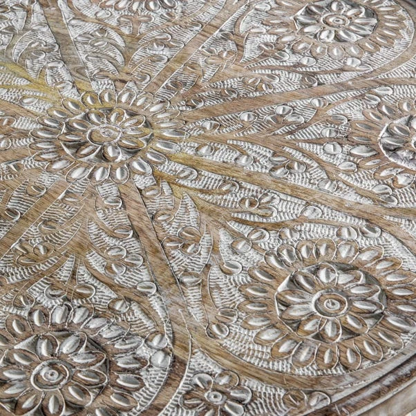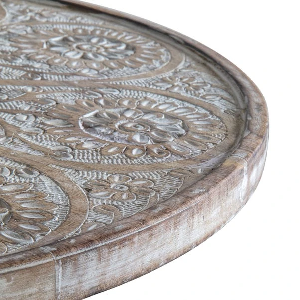 This side table boasts a soft natural finish and hand-carved details in a white-wash finish, ensuring it stands out in any room. The carvings are delicate and shallow, making it practical for everyday use while maintaining its aesthetic appeal. The hand-turned tapered legs add a touch of elegance, making this piece perfect for any living space.