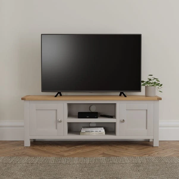 This wide Bromley TV unit comes complete with a fixed shelf, two ample sized cupboards and cable access, perfect for storing away household items and keeping cables neat and tidy.