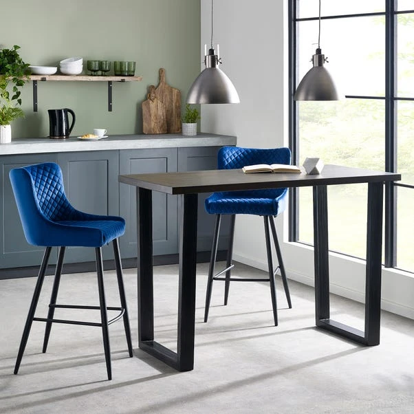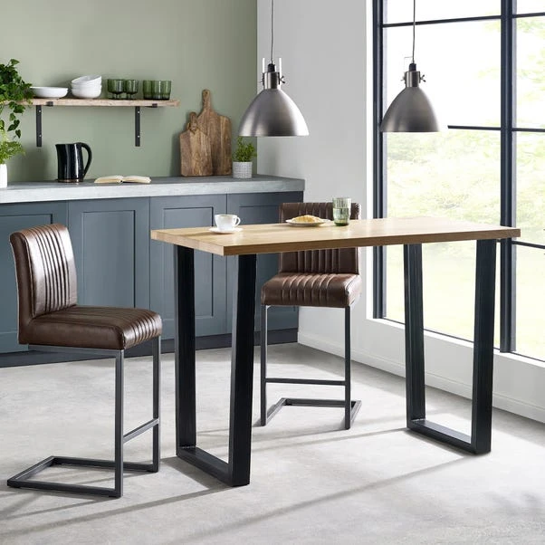 This bar table in oak is a stylish and functional addition to any bar or dining area. Made from solid oak, it features a rustic finish that emphasises the natural wood grain, adding a touch of vintage charm to the space. The industrial trapeze-style metal legs provide a sturdy and visually appealing support, creating a perfect blend of rustic and modern design elements. This table pairs beautifully with a wide range of upholstered bar stools, making it a versatile and practical choice for both contemporary and traditional settings.