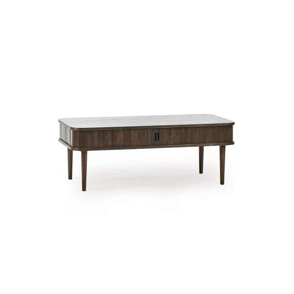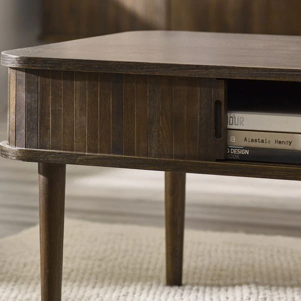 A centrepiece with character, this table features a dark oak-effect finish that adds richness and depth to your living room. Behind its slatted tambour doors lies a hidden storage area—perfect for stashing books, games or remote controls. The clean-cut silhouette is modern and versatile, with discreet cut-out handles that keep the look sleek and minimal.
