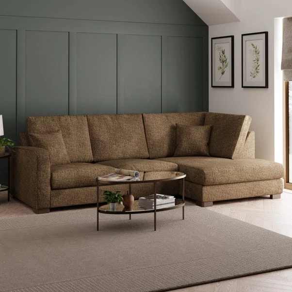 Made with comfort in mind, the Carson Corner Chaise would make a welcome addition to any home. Boasting sprung, foam-filled extra deep seats, and fibre-wrapped foam back cushions, this sofa is the perfect place to sink back into after a long day. The Carson features soft and hard-wearing chunky chenille upholstery available in a choice of trendy colours and styled with a piped edge detailing and complementing black wooden feet for a smart, sophisticated look. This sofa also features removable cushion covers for easy care, and is supplied with two matching scatter cushions.