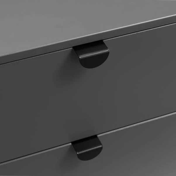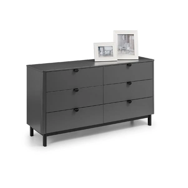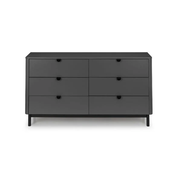This chest of drawers is a great place to keep your extra clothes and other knickknacks. It has six deep drawers that keep everything neatly tucked away and out of sight, with rounded corners for a softer look. The storm grey finish with satin black wooden legs and handles adds a stylish look to any home.