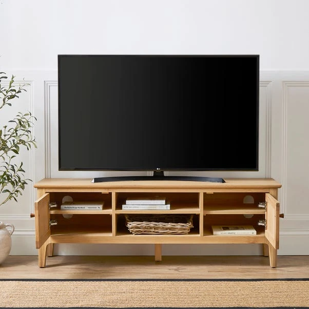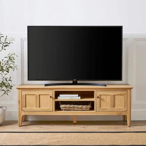 Enhance your entertainment area with the Walton Wide TV Unit, accommodating TVs up to 55″. With a magnetic stopper and a natural oak colourway, it’s not just a practical choice but also a stylish addition to your living room or bedroom.