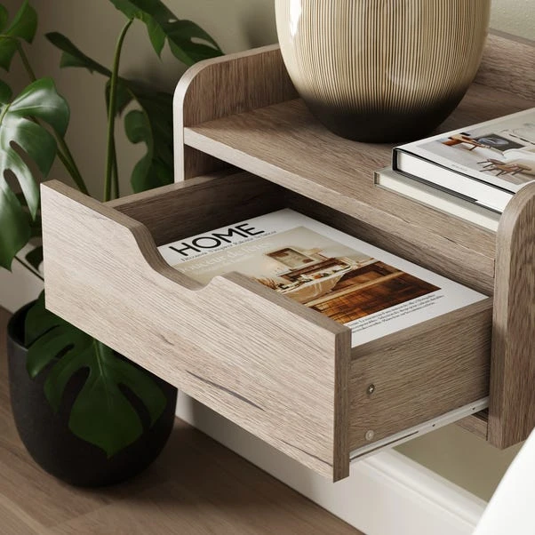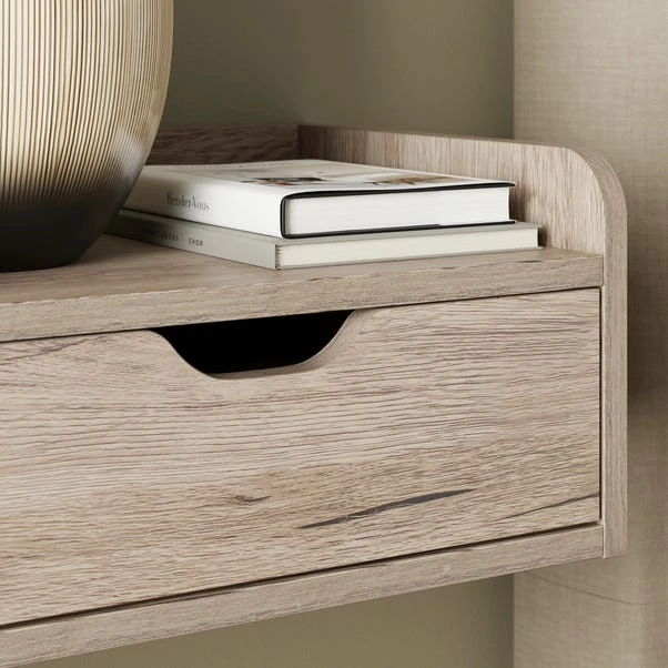 This Cilla floating bedside table is perfect for modern bedroom interiors – the floating design means there are no visible fixings, keeping the style sleek and contemporary. One drawer with a simple cutout handle gives storage space for your night-time items, and the table is finished in a grey oak effect for simple, understated style.