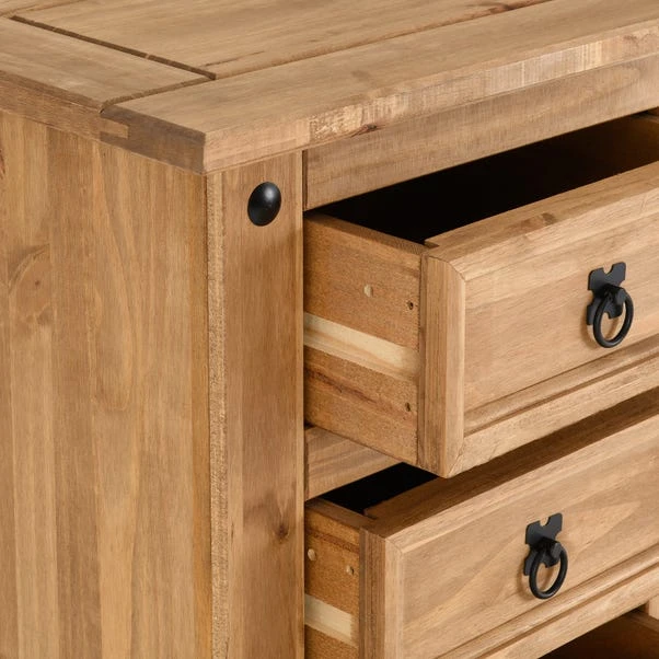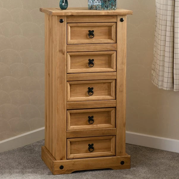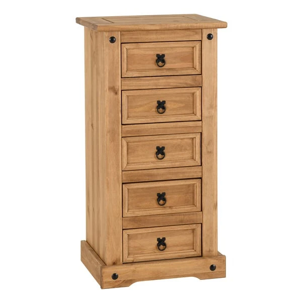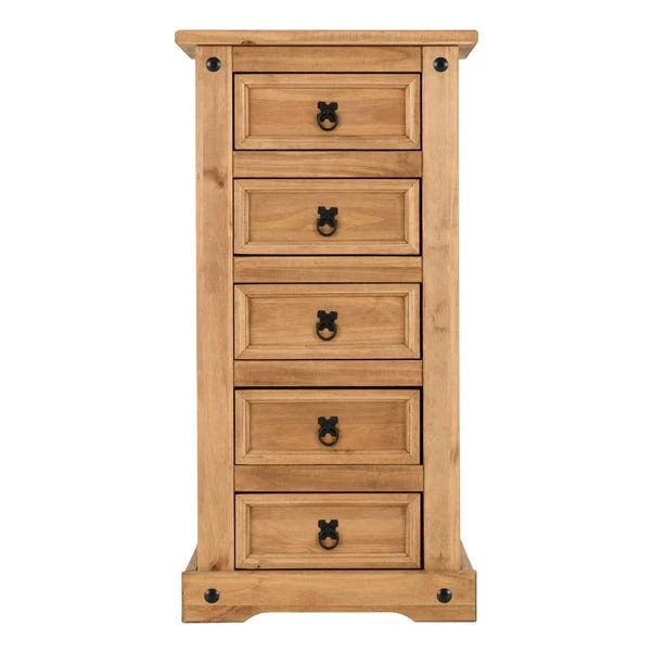 The Corona 5 Drawer Tall Chest boasts ample storage for your bedroom. This beautiful distressed waxed pine chest will bring a whole new look to your home. The attractive design with metal drop handles and the rich colour of the wood make it a superb piece of furniture to look at that is also highly functional. With five spacious drawers, there’s plenty of room to store your belongings. Installation Note: This product should be fixed to a wall using a wall fastener