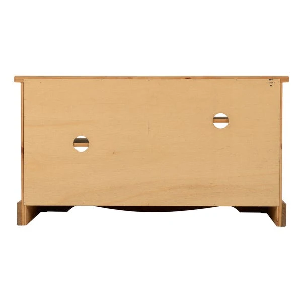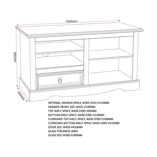 Complete with an abundance of storage, this classic TV stand features two shelves and cut-out holes to keep your wires tangle-free. Crafted with one drawer, this TV stand is designed with a glass door with extra shelves inside.