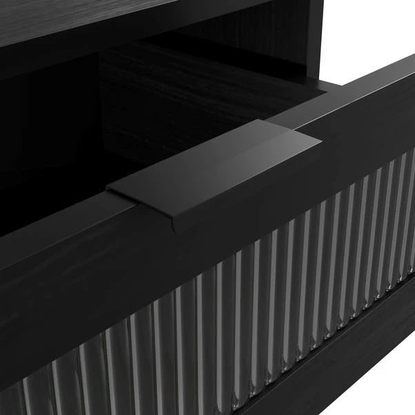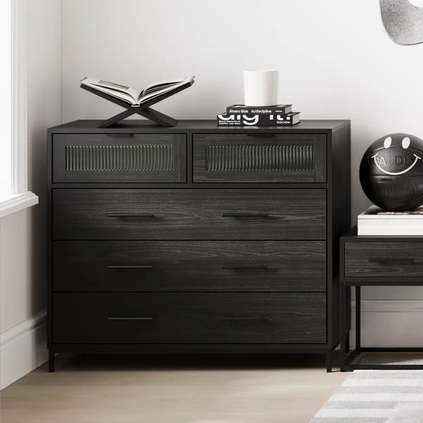 This chest’s striking matt black wood grain finish combined with the captivating reeded glass panels creates a visual masterpiece. The industrial-inspired metal frame not only adds a touch of edgy flair but also ensures long-lasting durability. Versatile and adaptable, this chest seamlessly integrates into any color scheme, making it a versatile and essential addition to your home decor.