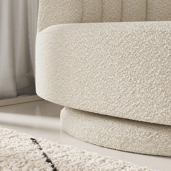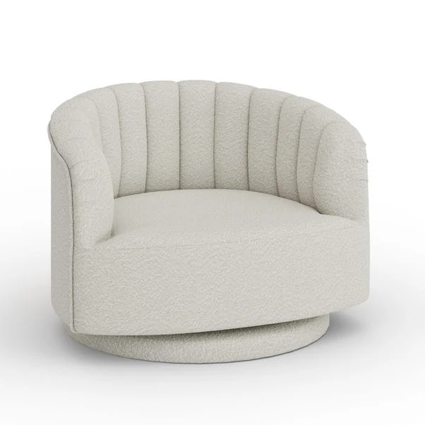 Upholstered in premium fabric and featuring a charming scalloped design, this chair brings a touch of sophistication to any space. Its swivel base offers effortless mobility, allowing you to turn and glide with ease. Sink into its plush seat and experience unparalleled comfort as you unwind after a long day.