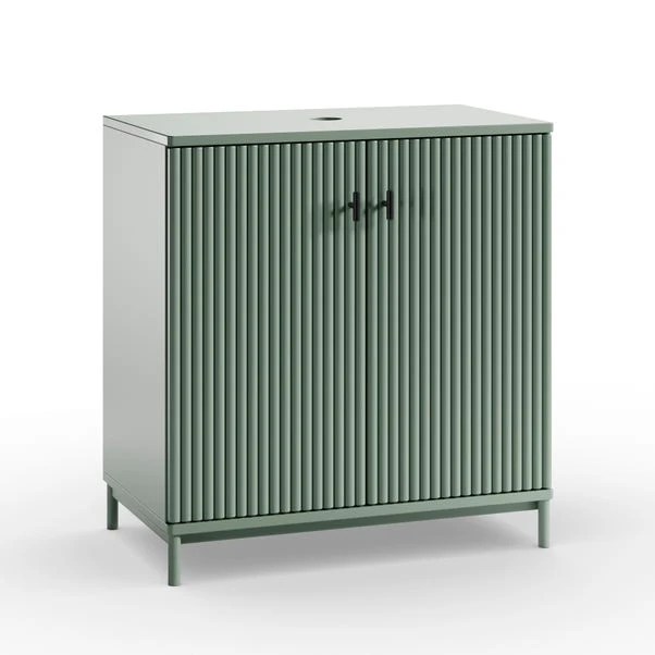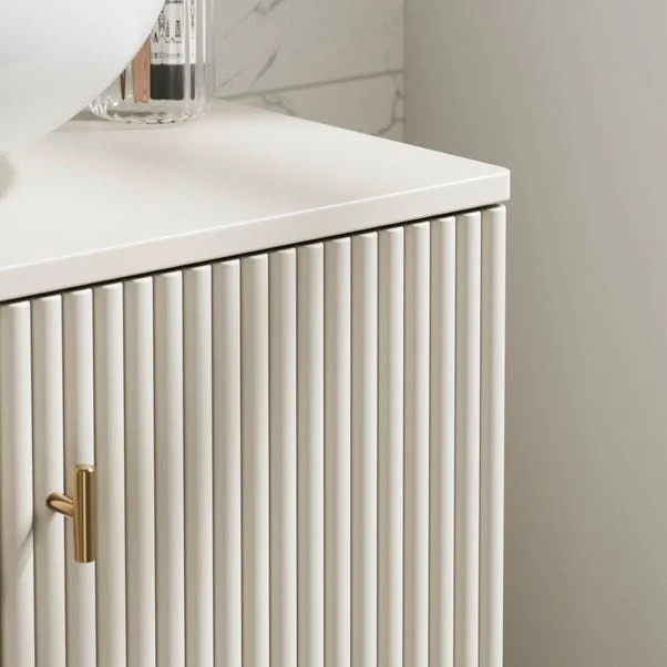 Combining style and practicality, the Elsie Single Vanity Unit features soft-closing doors, shelving for organised storage, and ribbed detailing for a refined look. The gold handles add a polished touch, making this piece a standout addition to any bathroom.