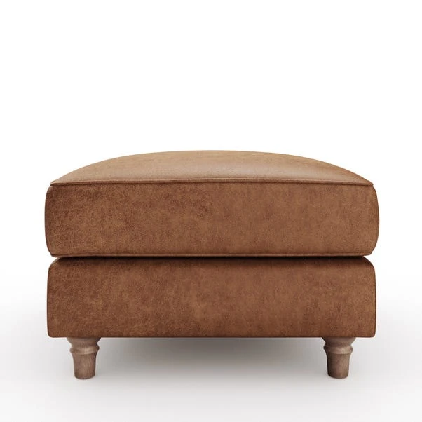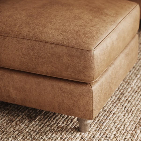 Featuring elegantly turned wooden feet, this footstool adds a touch of timeless style to any room. The durable faux leather upholstery is accented with piped edge detailing for a sophisticated touch. Enhanced with brand-new foam cushioning, it promises both comfort and durability.
