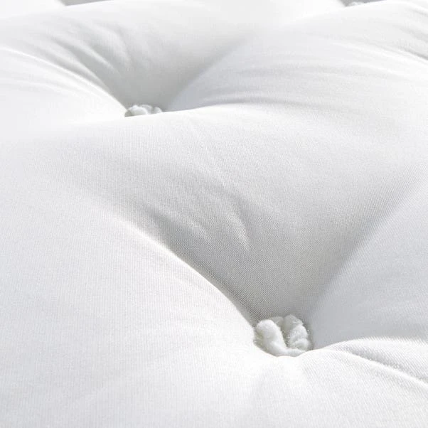 The filling of this mattress is a combination of wool and eco-flex material. Wool is a natural temperature regulator helping to keep you from becoming too hot or too cold as you sleep. This layer also acts as a moisture wick to absorb any body moisture. Eco-flex adds comfort to the mattress as it surrounds the springs to form additional padding and cushioning. It is also made from recycled clothing and textile fibres meaning it is kinder to the environment. Finished with a hand tufted cover to maintain the filling distribution and prevent it sinking where you sleep, this mattress features a quilted wire frame providing edge-to-edge support and is complete with 4 handles to make it easier to move.