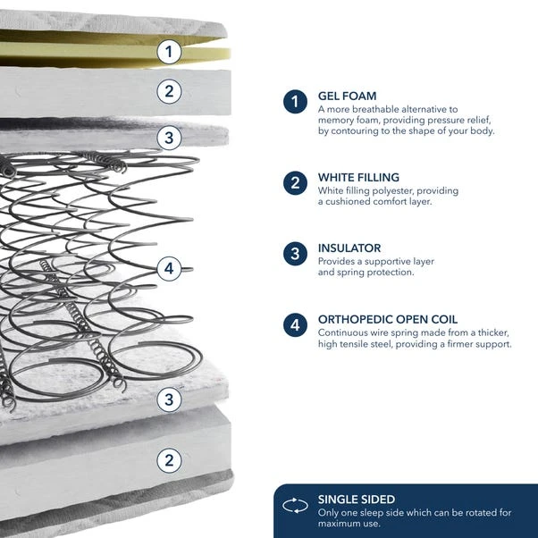 Experience orthopedic excellence with the Fogarty Just Right Gel Orthopaedic Open Coil Mattress. Boasting a 12.5g open coil Bonell spring and an orthopedic design, it provides the ideal blend of support and comfort. The 8mm gel layer adds a cool bounce-back feeling, and the wire frame ensures edge support. With a medium firmness, micro-quilted box border, and a soft touch grey knit panel fabric, this mattress is a harmonious symphony of support and style.