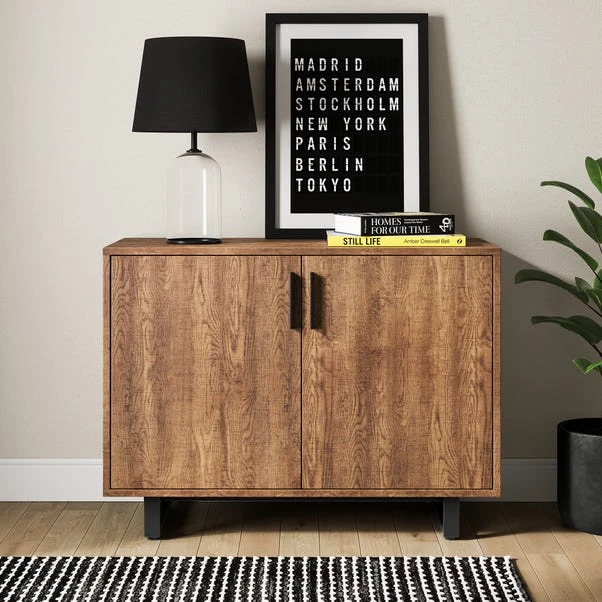 Maximize your storage space with the Freddie Small Sideboard. Featuring a sturdy steel bottom frame and 2 roomy shelved cupboards, this piece is perfect for storing everyday clutter in the dining room, living room, or hallway. Assembly is a breeze with illustrated instructions and all the hardware provided.