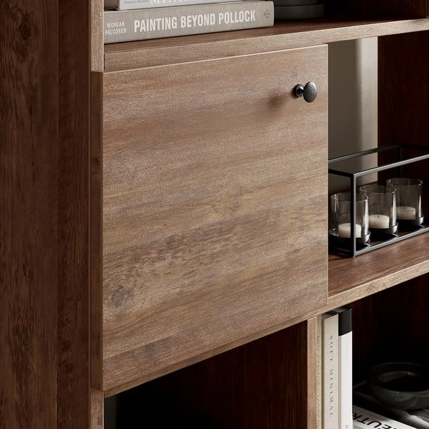 Designed with a straight edge finish, this stylish bookcase features six open shelves and two square cupboards, complete with adjustable hinged doors.
