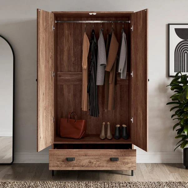 Here’s the deal with this stylish wardrobe: it does more than just store your stuff – it adds a little industrial-inspired style to your home. Featuring a rustic pine effect finish and black metal handles. With spacious hanging rail and drawer space, you’ll be more organised than ever before.