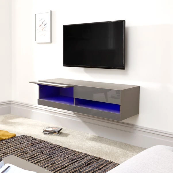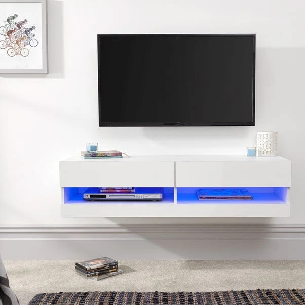 Crafted with a contemporary, minimalist design, the Galicia 120cm wall tv unit would be a great addition to any modern living room and is available in a choice of black, grey or white colourways. This self-assembly stand features two spacious open shelves, with two lift-up doors to allow easy access whilst keeping the design low-profile when closed. The TV unit also comes with a hidden AV access point allows cables to be hidden out of sight and battery-operated LED lights, perfect for illuminating your consoles and devices beneath or to provide mood lighting.