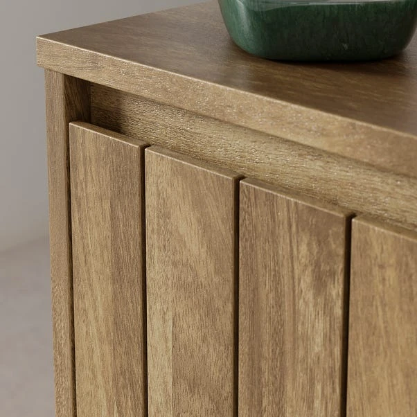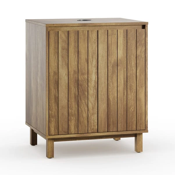 This under-sink unit with a mango wood-like appearance neatly slides beneath your current sink, offering an intelligent, space-saving answer for concealing all your bathroom necessities and personal care items. Featuring a slatted wood-like finish, along with two doors and two shelves, this piece seamlessly blends style with functionality.