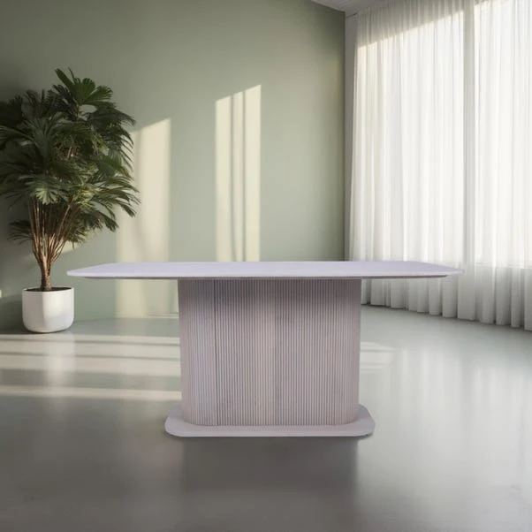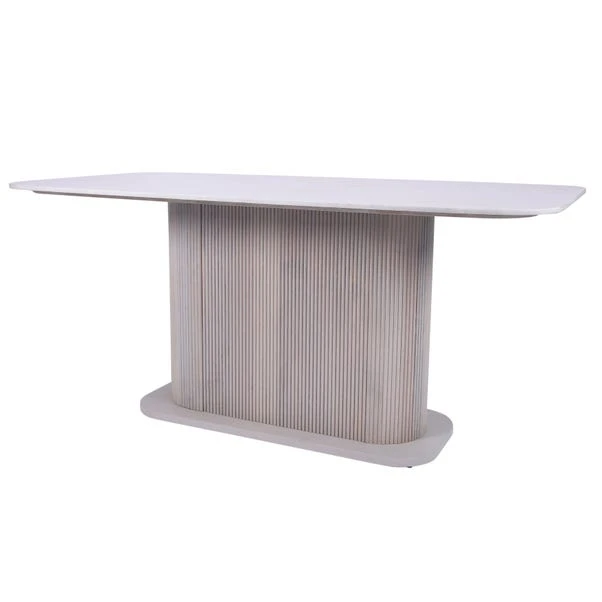 The Cleo Dining Table is designed to be the heart of the dining room, where style and function come together in perfect harmony. Featuring a sleek boat-shaped marble top, this table offers an expansive surface ideal for everyday meals, special occasions, or dinner parties. The striking vertical ribbed base, crafted from solid mango wood, adds an element of sculptural beauty while maintaining stability. A slatted wood surround design enhances its contemporary appeal, making it a standout feature in any space.