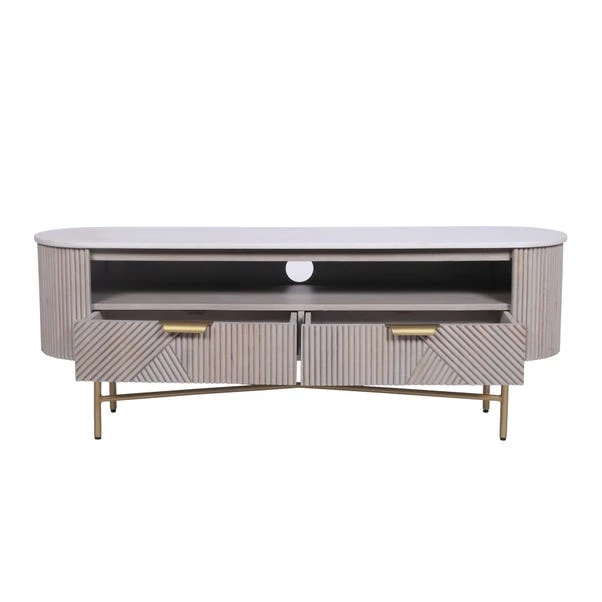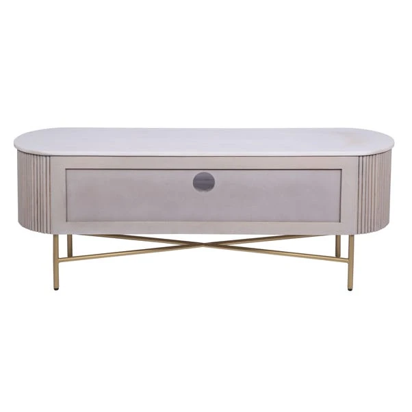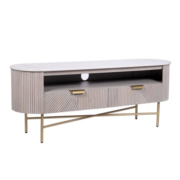 Designed with a focus on both aesthetics and practicality, the Cleo TV Unit blends natural textures with a contemporary silhouette. Crafted from solid mango wood, its vertical ribbed design adds character and dimension, while the smooth marble top provides an elegant contrast. Two spacious drawers and additional storage compartments offer a practical solution for organising media devices, accessories, and essentials.