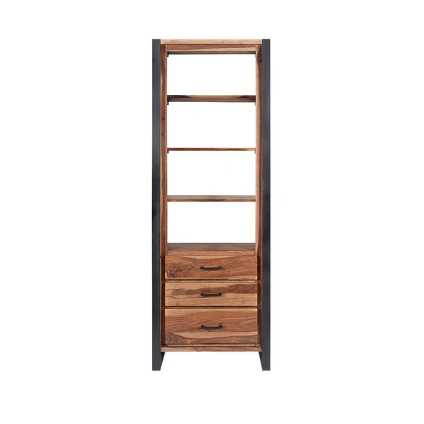 A perfect blend of practicality and style, the logan bookcase is designed to bring effortless organisation to your home. Crafted from solid Sheesham wood with a natural finish, it highlights the wood’s rich grain and warm tones, adding a touch of rustic charm. Its open shelving provides ample space for displaying books, ornaments, or treasured keepsakes, while three spacious drawers offer concealed storage for a clutter-free look. The sleek black metal legs lend a contemporary contrast, ensuring this piece complements both modern and traditional interiors.