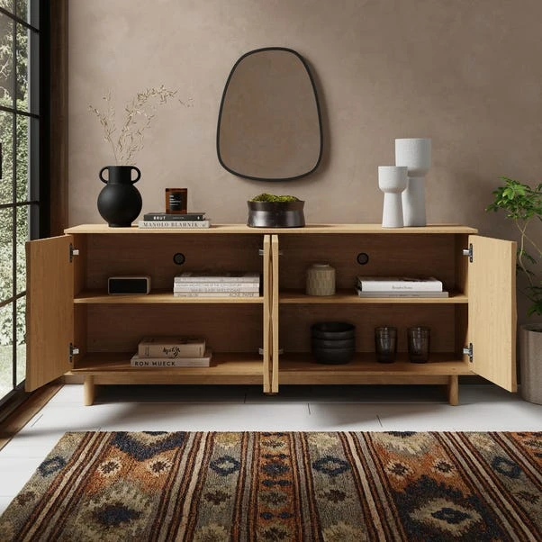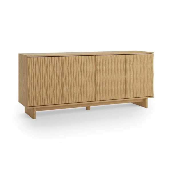 This unit’s carved front design adds a touch of refined detail, creating a visually striking focal point for any room. Featuring adjustable shelves, this sideboard provides versatile storage options, allowing you to organise your belongings with ease. Whether used in a dining room to store tableware, in a living area for books and decor, or in an entryway to stow essentials, this sideboard is as functional as it is stylish. The addition of cable management features makes it a great option for integrating electronics or small appliances, ensuring a neat and organised appearance throughout your home.
