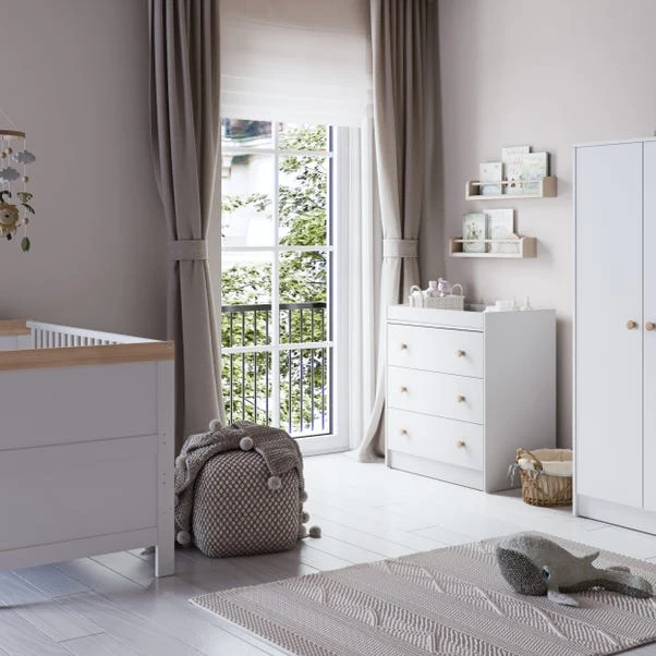 The Little Acorns Florence Cot Bed combines a modern yet traditional feel with stylish looks and practical features at fantastic value. The cot bed, with its white and oak accents, offers three adjustable mattress heights and easily converts into a toddler bed, making it both on-trend and timeless. The teething rails protect your baby’s teeth and gums, ensuring comfort as they grow.