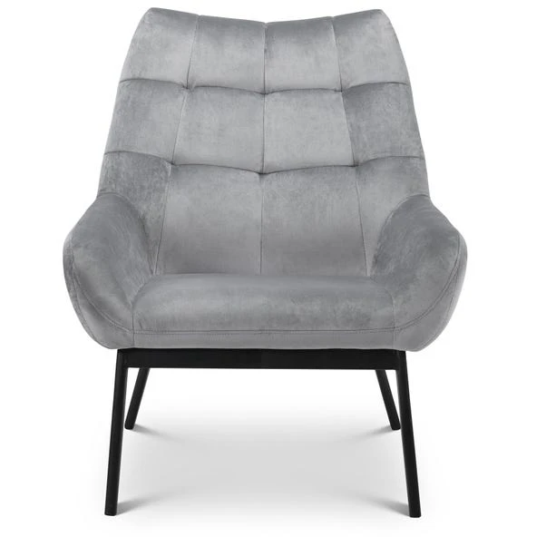 This modern interpretation of a classic 70s design brings a touch of nostalgia with a stylish twist. Upholstered in plush grey velvet fabric, the Lucerne chair features a relaxed frame with a tufted back, offering both comfort and visual appeal. Its sleek silhouette is complemented by a sturdy black metal frame, adding an industrial edge to its design.