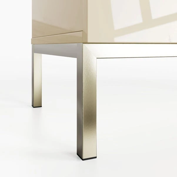 This sideboard is a piece that combines sophistication with smart functionality. Its fully painted high-gloss exterior paired with a sleek glass top, offers a modern and chic look. The pendant handles and brushed metallic feet in a subtle champagne shade add a refined touch, making it a true statement piece. This sideboard is not only stylish but also smart, featuring built-in LED lights that you can control with the Frank Olsen app or via your smart speaker. Additionally, a wireless charging spot eliminates the hassle of tangled cords, allowing you to power up your phone effortlessly. Assembly is a breeze with the quick click-together system, ensuring a seamless finish with no visible fixings.