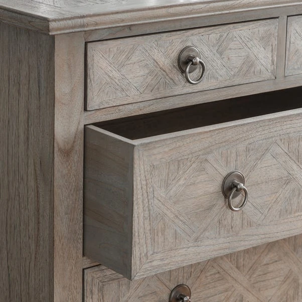 The Modesto 5 Drawer Chest, crafted from Mindy Ash wood brushed to create natural ageing, seamlessly blends French Colonial style with modern interiors. With five drawers and matching items available, this chest offers both functionality and a touch of timeless elegance.