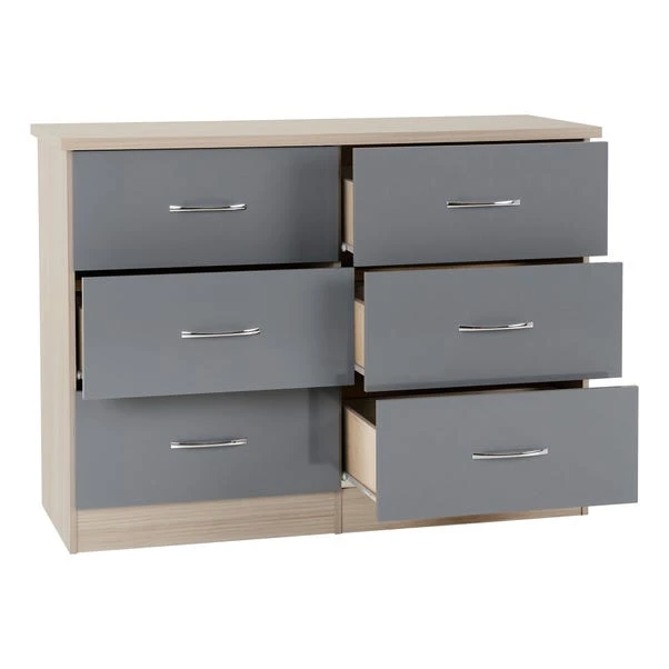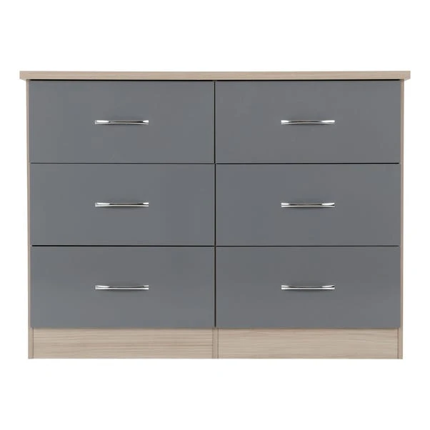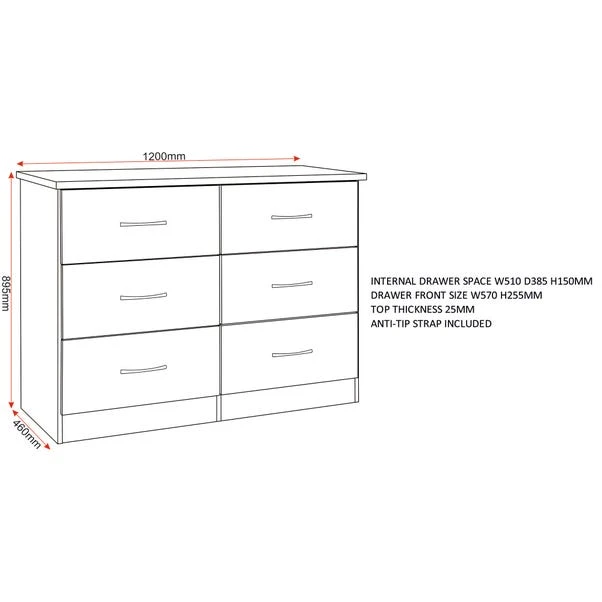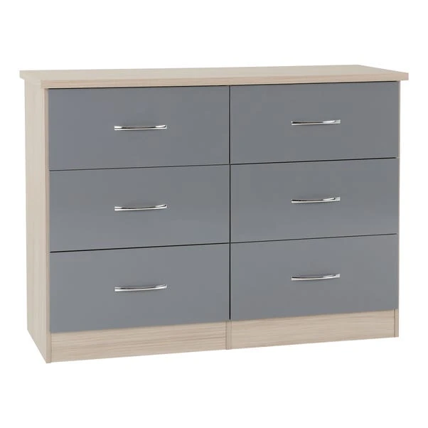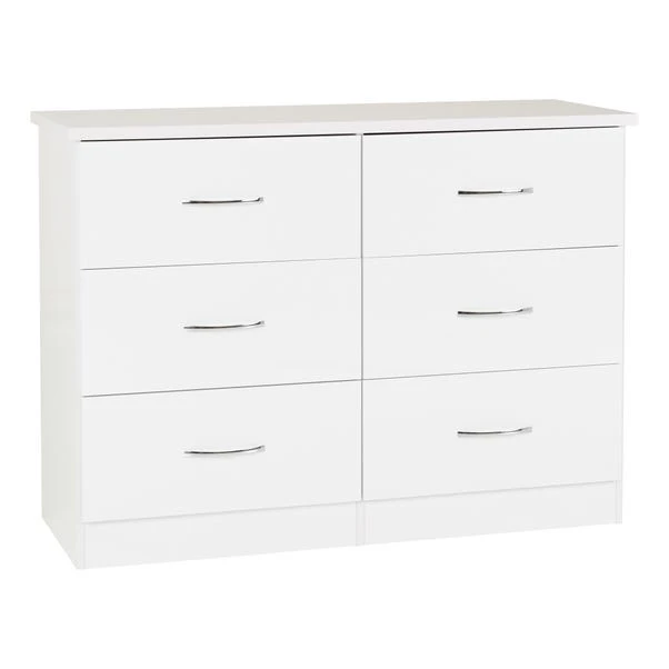 The Nevada 6 Drawer Chest features a contemporary design owing to the gloss finished front which contrasts perfectly with the metal handles. The Nevada has your storage needs covered thanks to the ample drawer space which sits on sturdy metal runners.