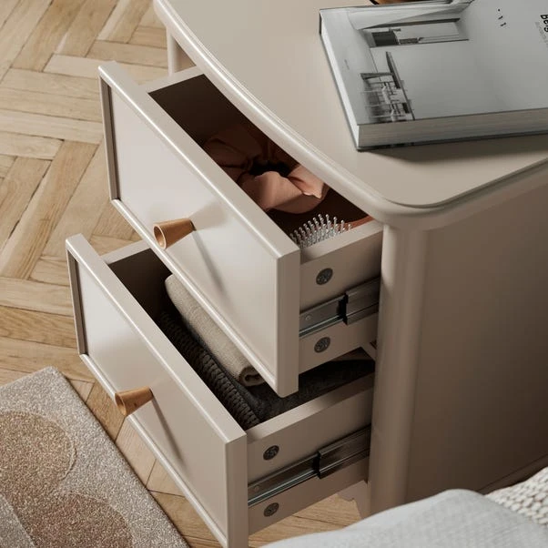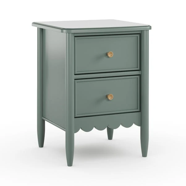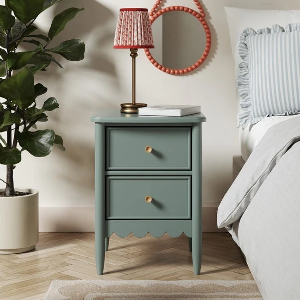 Adorned with a gorgeous natural painted wood finish, this bedside table creates a sense of natural beauty in your bedroom. The soothing grey hue brings a refreshing touch to your bedroom, creating a striking atmosphere that brings a feel of relaxation and peaceful sleep. The rounded edges of this bedside table create a gentle and inviting silhouette, offering a touch of softness to your bedside area. Its scallop apron adds a graceful and sophisticated element, infusing your space with a hint of whimsy. The drawers provide ample storage space for your bedtime essentials, keeping them conveniently within reach yet neatly hidden away. To complete your dream bedroom ensemble, we offer a matching collection of bedroom furniture within the same design range. From spacious wardrobes to elegant dressing tables, you can effortlessly create a cohesive and harmonious look throughout your space.