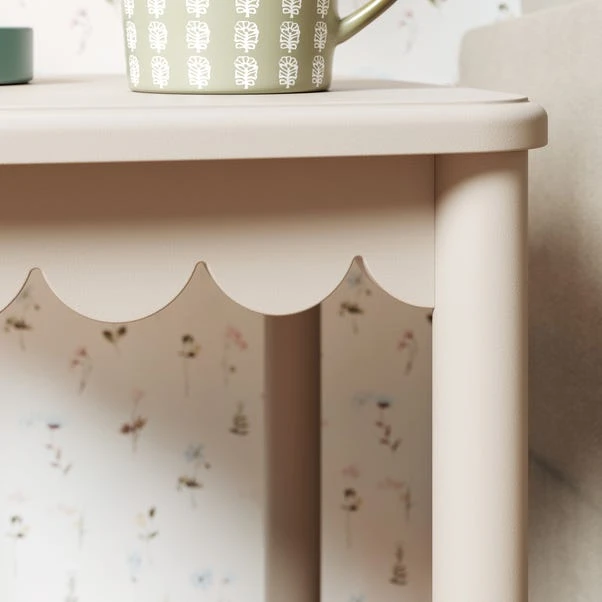 This delightful side table boasts a distinctive rounded edge and a scallop apron, showcasing exquisite craftsmanship and attention to detail. The solid wood legs provide sturdy support while enhancing the table’s overall aesthetic appeal. With a thoughtfully designed open shelf, this side table offers both style and convenience, allowing you to display decorative items or keep everyday essentials within easy reach.