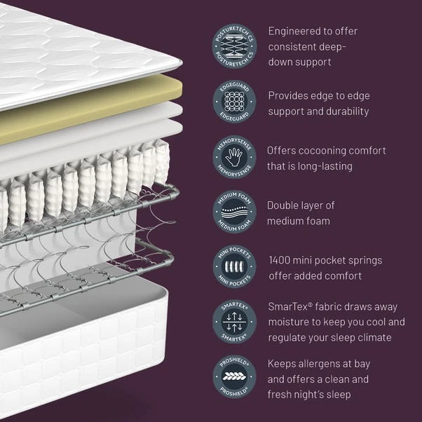 An additional layer of 1400 mini pockets sit alongside the spring unit for added comfort, and a MemorySense® foam layer provides extra comfort where it’s needed the most. It responds to your shape for a cocooning feel, with a layer of medium foam to finish.