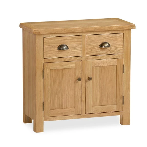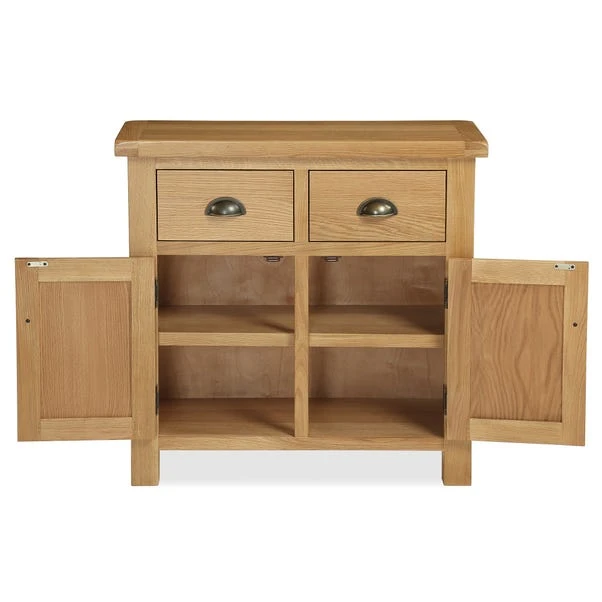 Featuring two spacious drawers made from pine wood and one cupboard equipped with a full length fixed shelf, this fully assembled mini sideboard is designed with solid oak edging on the legs and top surface and antique metal cup handles and doorknobs.