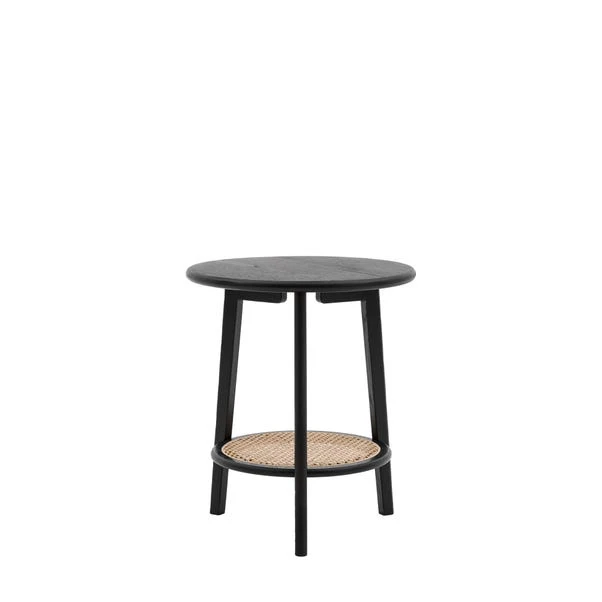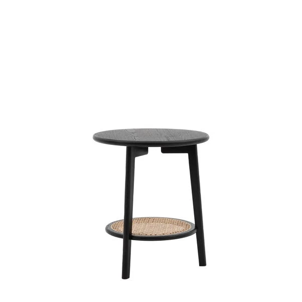 With a hint of art deco this range is overflowing with statement stand out style. In dramatic black stained solid oak the round bedside table is the perfect spot to rest a lamp and bedtime book. The woven rattan lower shelf adds extra storage and a striking contrast of materials and colour.