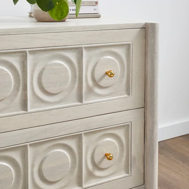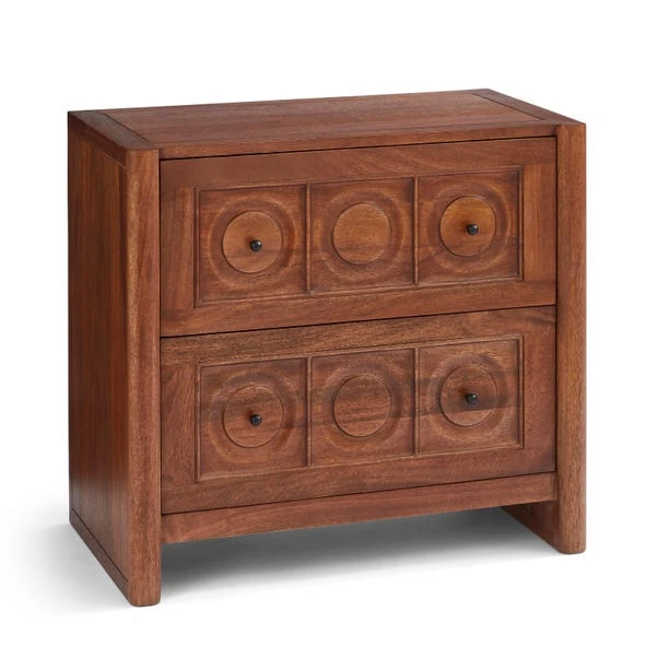 Blending functionality with natural beauty, this bedside unit is a stunning addition to any bedroom. Crafted from solid mango wood, with a carved detail front, it showcases the rich textures and unique grain patterns that make each piece truly one of a kind. With two spacious drawers, it offers generous storage for your bedside essentials, all while maintaining a sleek and minimalist aesthetic. The natural warmth and character of mango wood gives this unit organic charm, adding a touch of rustic elegance that enhances any bedroom décor.