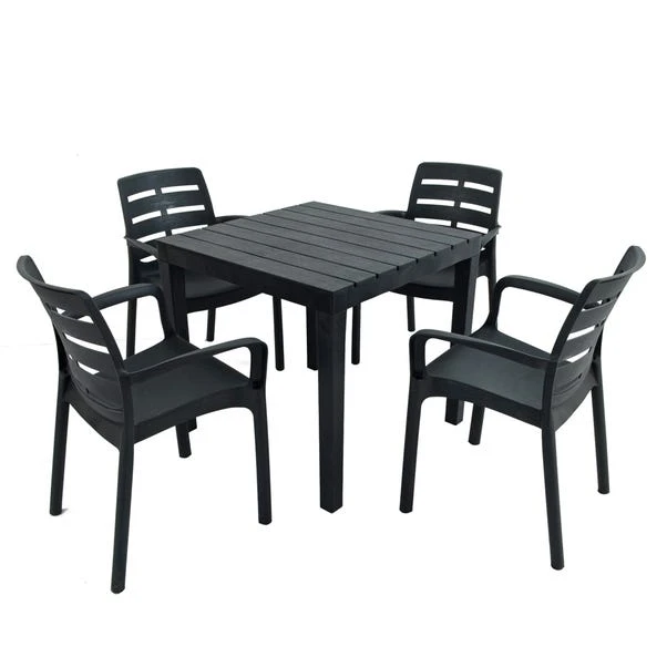 This 4 seat set would make a lovely affordable dining set forth garden, the table is sturdy and comfortably seats 4, the chairs are stacking and require no assembly. All components are made using durable polypropylene and can be left out all year round.