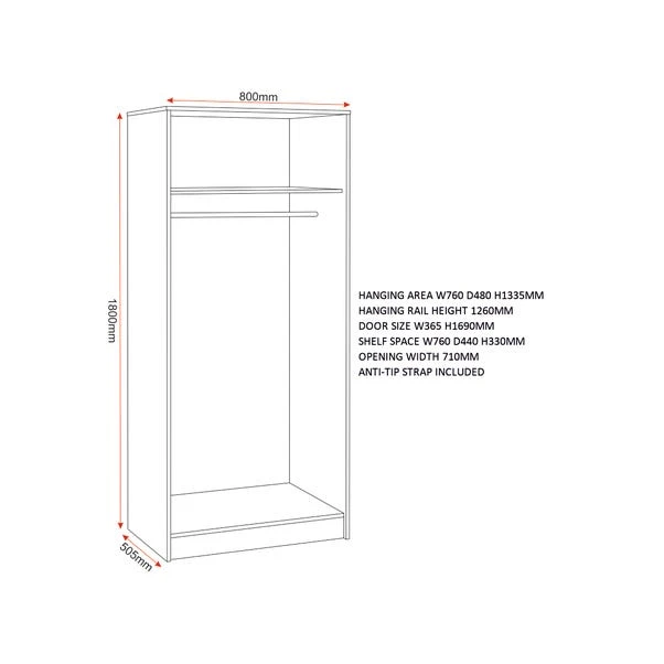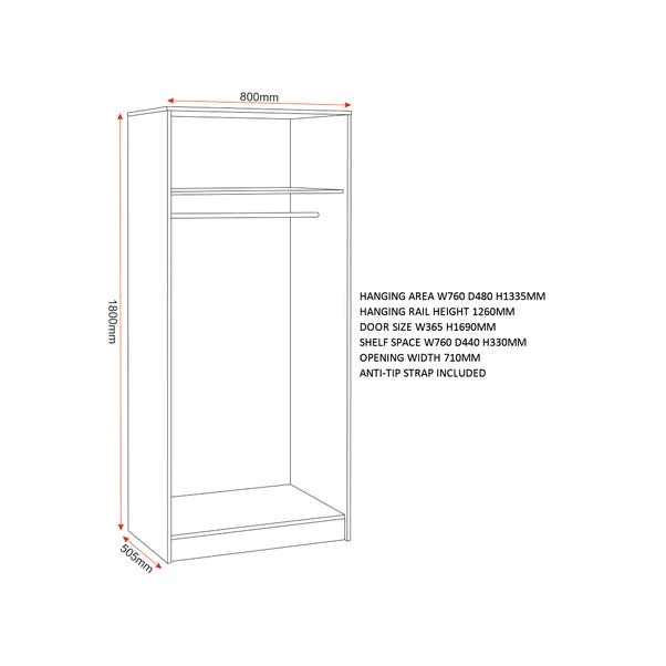 Wardrobe: H 180cm x W 115cm x D 50.5cm