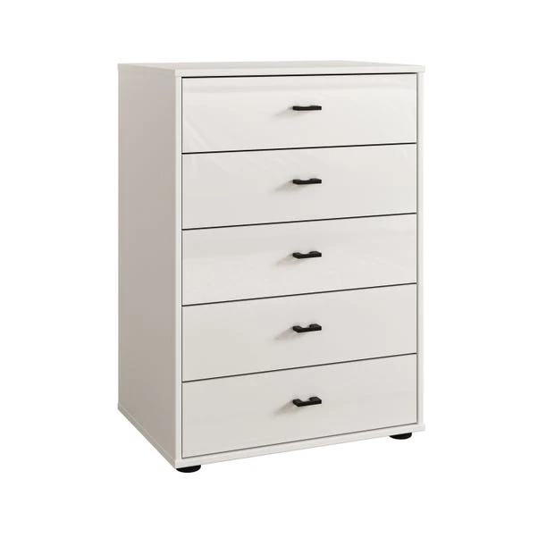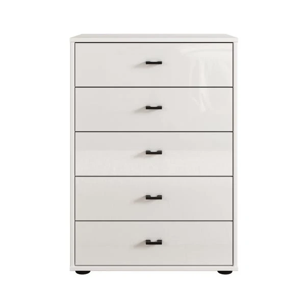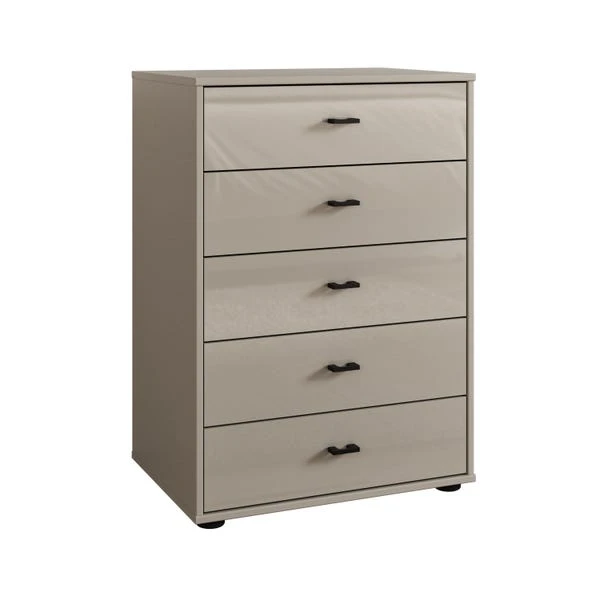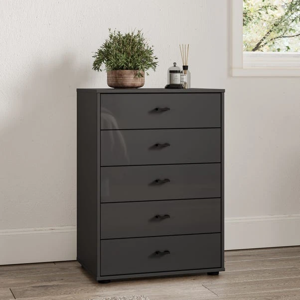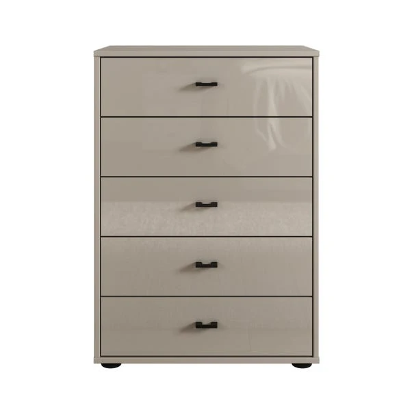 Experience elegance and practicality with the Kahla Glass Fronted Small 5 Drawer Chest. Available in a choice of trendy colours, this chest boasts modern slate coloured handles, adding a touch of sophistication to the glass fronted drawers. Perfect for smaller bedroom spaces, this chest of drawers is designed with longevity in mind, crafted with highly resilient metal fittings and scratch resistant fronts. Delivered fully assembled, the Kahla Chest of Drawers will seamlessly integrate into your bedroom and provide plenty of useful storage space.