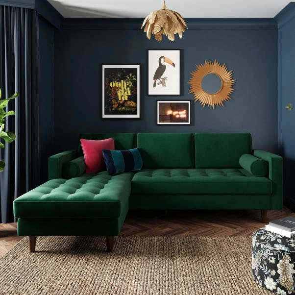 Bring some modern retro styling to your living room with the stylish Zoe Corner Chaise. Finished in a trendy colourway, this sofa features a soft and stylish velvet fabric upholstery, styled with piped edge detailing and stylish tapered solid wood legs. As stylish as it is comfortable, the Zoe corner sofa is the perfect place to sit back and put your feet up, featuring a foam filled, sprung seat and fibre filled back cushions, as well as two matching bolster cushions to boot. This corner sofa has non-reversible back cushions and fixed seat cushions.